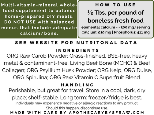 Outstanding 100% organic whole food multi-vitamin-mineral supplement formulated to be used for balancing the calcium to phosphorous ratio of home-prepared raw or cooked meals for dogs, cats and other carnivores.