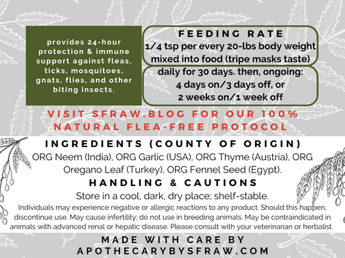 PLEASE BE ADVISED: Visit sfraw.blog for our 100% natural flea-free protocol, which we highly recommend implementing for flea control. We stand firm in our position that there’s no single internal or external remedy that will provide safe & effective protection against parasites such as fleas. Please read our blog to learn about a Natural Rearing holistic approach that focuses on the animal’s environment. In our opinion, this Natural Rearing holistic approach is the only truly effective and safe way to eliminate or control fleas.